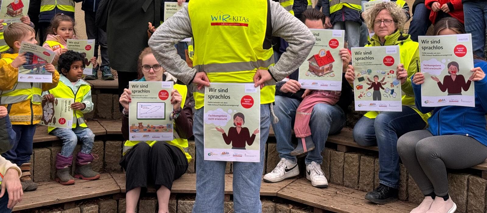 Auf unserem Außengelände an der Kita Feldwasser wurde es am 27.03. laut und das aus gutem Grund. Gemeinsam mit Eltern, Unterstützern und unserem Team haben wir ein deutliches Zeichen gegen die aktuelle Kita-Politik in NRW gesetzt.