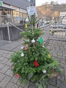 Unser Weihnachtsbaum ist gut sichtbar gegenüber vom Rathaus an der Ecke „Genussvoll“ ausgestellt und lädt alle Besucherinnen und Besucher zum Staunen und Verweilen ein.